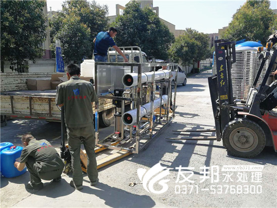 這套型號為YB-CJS-005,每小時出水5噸的單級水處理設(shè)備是發(fā)往新鄉(xiāng)的,工人們冒著炎炎夏日正在裝車發(fā)貨。